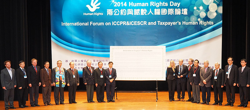 台灣人權大步走,國際人權兩公約(公民與政治權利國際公約及經濟社會文化權利國際公約)國內施行法推動至今五年,在財稅上落實成效廣受國人關注。人權日前夕(12/9),民間團體舉辦「兩公約與賦稅人權國際論壇」,邀請歐洲多國及國內專家學者及民間團體參與,檢視兩公約對賦稅人權保障上是否具備成效。中華人權協會理事長李永然、聯合國NGO世界公民總會主席Rene Wadlow 瑞內.瓦德羅博士、法務部次長陳明堂、歐洲刑事法與國際刑事法研究中心教授Arndt Sinn均發表致詞,與會學者並共同簽署英文版賦稅人權宣言。