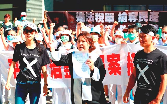 「財政部與執行署聯手霸凌太極門,抹黑欠稅!」7月31日上午聲援群眾聚集行政執行署苗栗分署前,抗議執行署明知最高行政法院判決認定國稅局81年稅捐有錯,太極門並無欠稅,卻仍違法強行拍賣太極門位於苗栗的土地,更違反公開投標作業程序,以黑箱作業引發眾怒。法稅改革聯盟聯盟召集人、前台大法學院教授陳志龍赴苗栗聲援,當場提出5點異議。下午平反1219行動聯盟、法稅改革聯盟及太極門弟子代表60多人再度前往士林地檢署控告法務部行政執行署署長林慶宗、副署長陳盈錦涉犯違法徵收罪。
